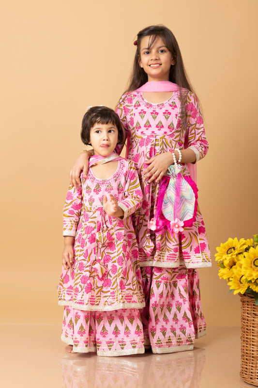 Girls- Kids Pink Kurti Sharara and dupatta set ethnic wear