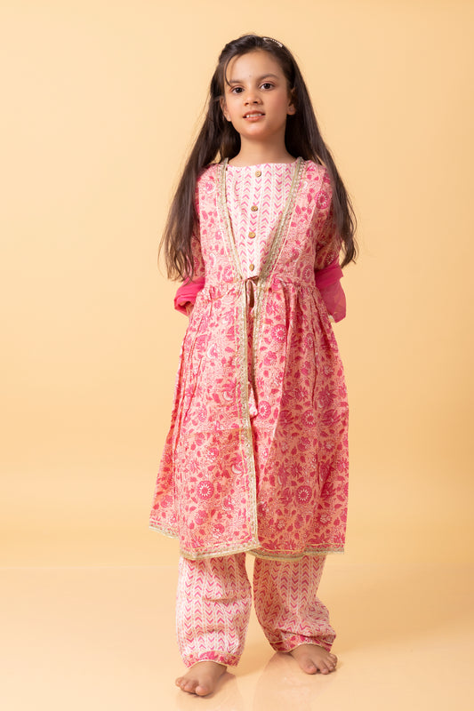 Handblock- Pure 100% Soft Cotton Pink Blossom Kurta Jacket Set