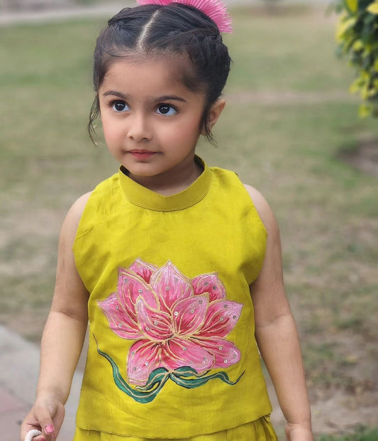 Lotus Hand Painted Girls Crop-Top Pant Co-ord Set - Lime color